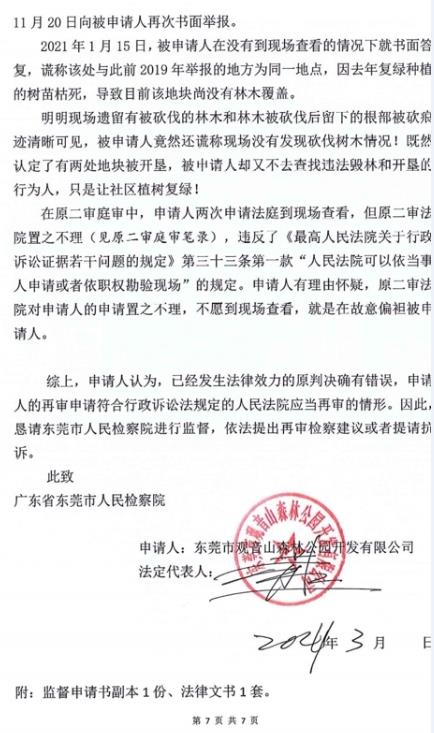 除此之外,观音山近日还向东莞市人民检察院提起《监督申请书》:申请人东莞市观音山森林公园开发有限公司因与被申请人东莞市林业局不履行法定职责案, 不服东莞市第一人民法院(2021)粤1971行初1384号行政判决和东莞市中级人民法院(2022)粤19行终580号行政判决,向广东省高级人民法院申请再审,广东省高级人民法院于2023年11月29日作出(2023)粤行申982号行政裁定,驳回了申请人的再审申请,申请人认为原一审、二审判决确有错误,根据《人民检察院行政诉讼监督规则》第十九条第一款第一项的规定,向东莞市人民检察院申请监督请求东莞市人民检察院向东莞市中级人民法院提出再审检察建议,或者提请广东省人民检察院抗诉,要求法院再审判决撤销东莞市第一人民法院(2021) 粵1971 行初1384号行政判决和东莞市中级人民法院(2022)粵19行终580号行政判决,判令被申请人依法履行职责。