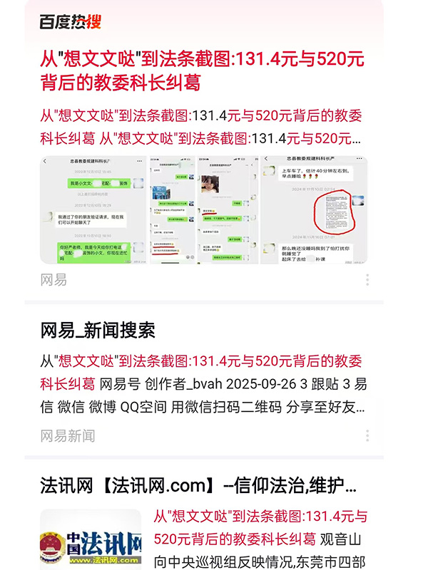 此前(2025923)报道了《从“想文文哒”到法条截图:131.4元与520元背后的教委科长纠葛》一文,披露了县教委一严姓科长在微信中发出“想文文哒”等亲密话语及含有131.4元、520元象征性红包的记录,引发对公职人员作风的广泛质疑。